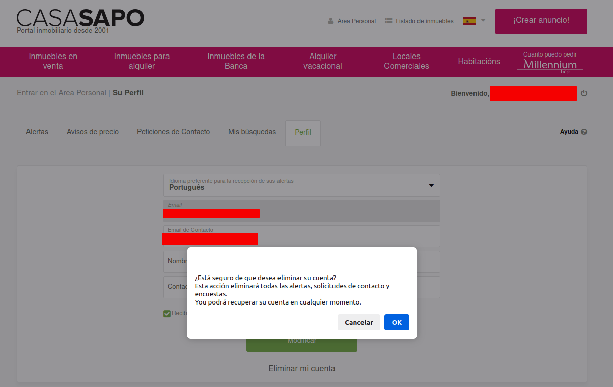 El usuario puede eliminar su cuenta en cualquier momento, a través de https://casasapo.es/AreaPessoal/AreaPessoal.aspx?MCSPage=userProfile.